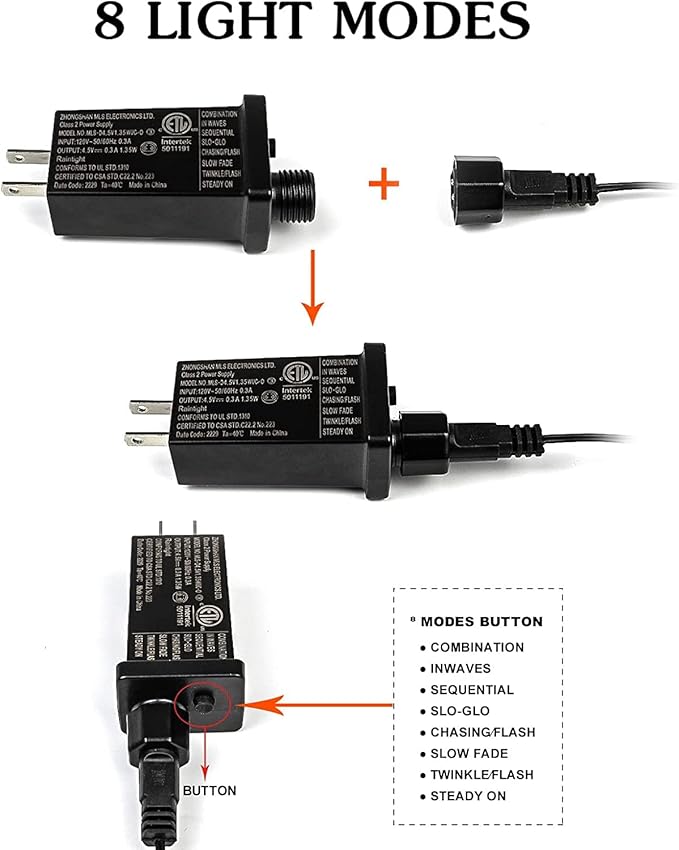 - Convenient Timer Function & 8 Modes & Memory Function: The button is at the end of the plug to turn on/off the timer function, press the button for few seconds till the green light on/off to turn on/off the timer function and switch 8 modes (combination, in waves, sequential, slo glo, chasing/flash, slow fade, twinkle/flash, steady on). This fairy lights could remember the setting of previous night you set.