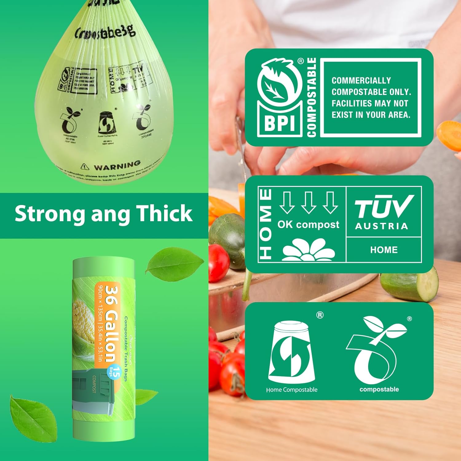 - ๐ใFOR FOOD WASTE&YARD WASTE&ORGANIC WASTE RECOVERYใThe compostable trash bag size of 33-36 gallon are great for compost bin kitchen to collect food scraps,also can be used as kitchen trash bags, yard waste bags .The large compost bags are perfectly fit most large compost can design with star-sealed at the bottom. Kitchen compost bags are extra thick 1.28 Mils, durability leave no space to leak and not easy to tear.