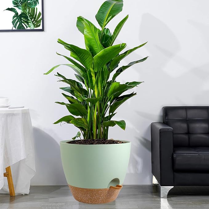 12 inch Large Self Watering Pots, Plastic Planters with 60oZ Removable Deep Reservoir and Multi Mesh Drainage Holes for Indoor Outdoor Garden Plants and Flowers, Green with Brown