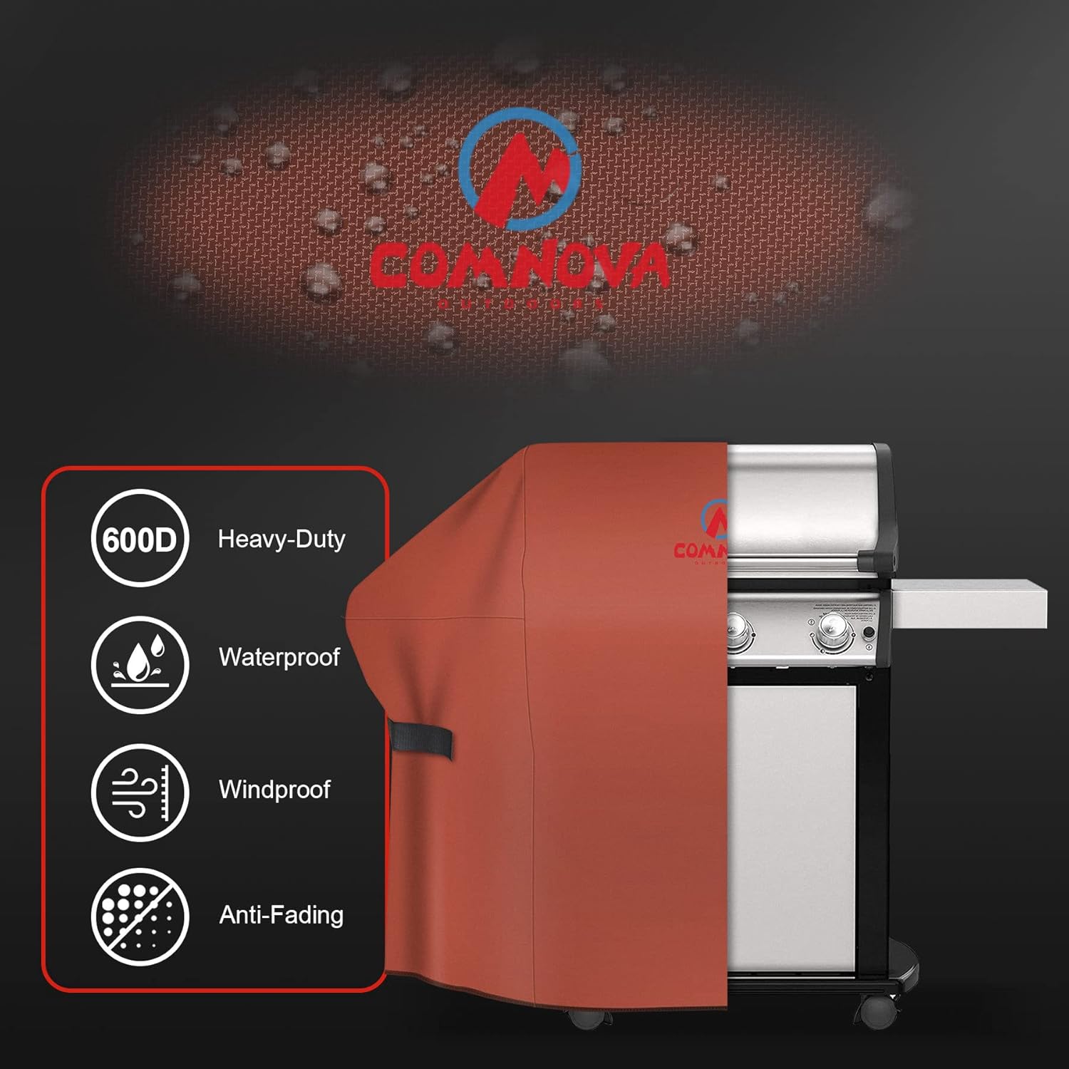 - | Heavy Duty and Waterproof Cover | - Comnova bbq gas grill covers are made of 600D heavy-duty oxford cloth with waterproof PU coating And UV-resistant coating. Compared with PVC, our bbq covers are softer and more breathable. Our barbecue grill covers can protect your bbq grill from heavy rain, snow, straight sunshine, tear and fading. More importantly, PU coating is more environmentally friendly!