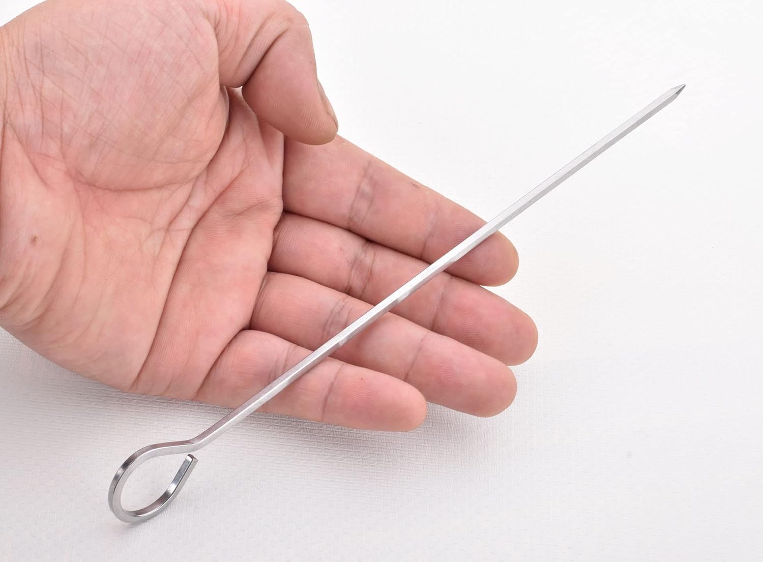 - Our 8"metal skewers is long enough that you can leave the end outside of the grill lid and turn them without opening the grill let out heat and short enough to pack in as much meat as you can while able easily remove all food from the kebab skewers;