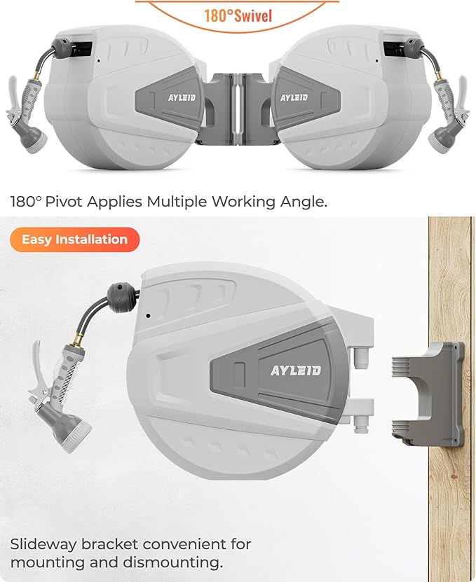 - 【Package included】1pc Ayleid Reel with 100FT Hose; 1pc Hose Nozzle; 1pc 9 Function Spray Nozzle; 1pc Wall mount; 4pcs bolts; 1pc User's Manual.