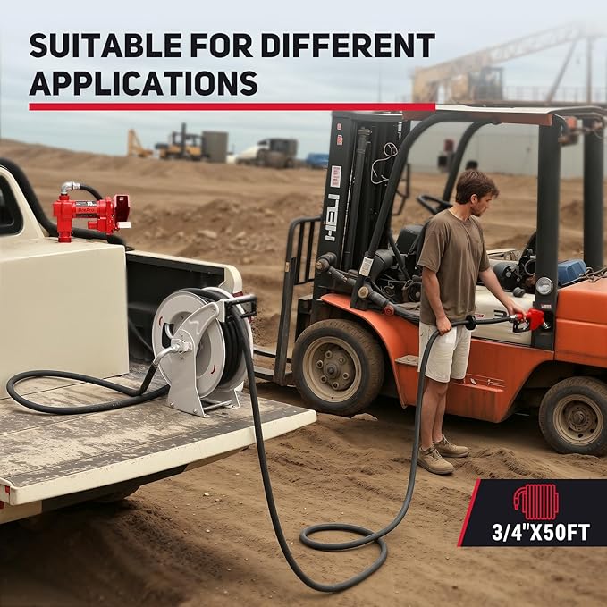 - Diesel Hose Reel with 50ft Hose: Coming with an industrial-grade rubber hose, strength and bending flexibility, resistance to abrasion, heat, ozone, and can work in the toughest conditions -68°F to 68°F (-20°C to 20°C). 50 feet in length, 3/4'' diameter hose gives you extra length to work with. Also, rated to a maximum pressure of 300 PSI, capable of delivering fast flows & precision volumes of fuel, diesel or kerosene, etc