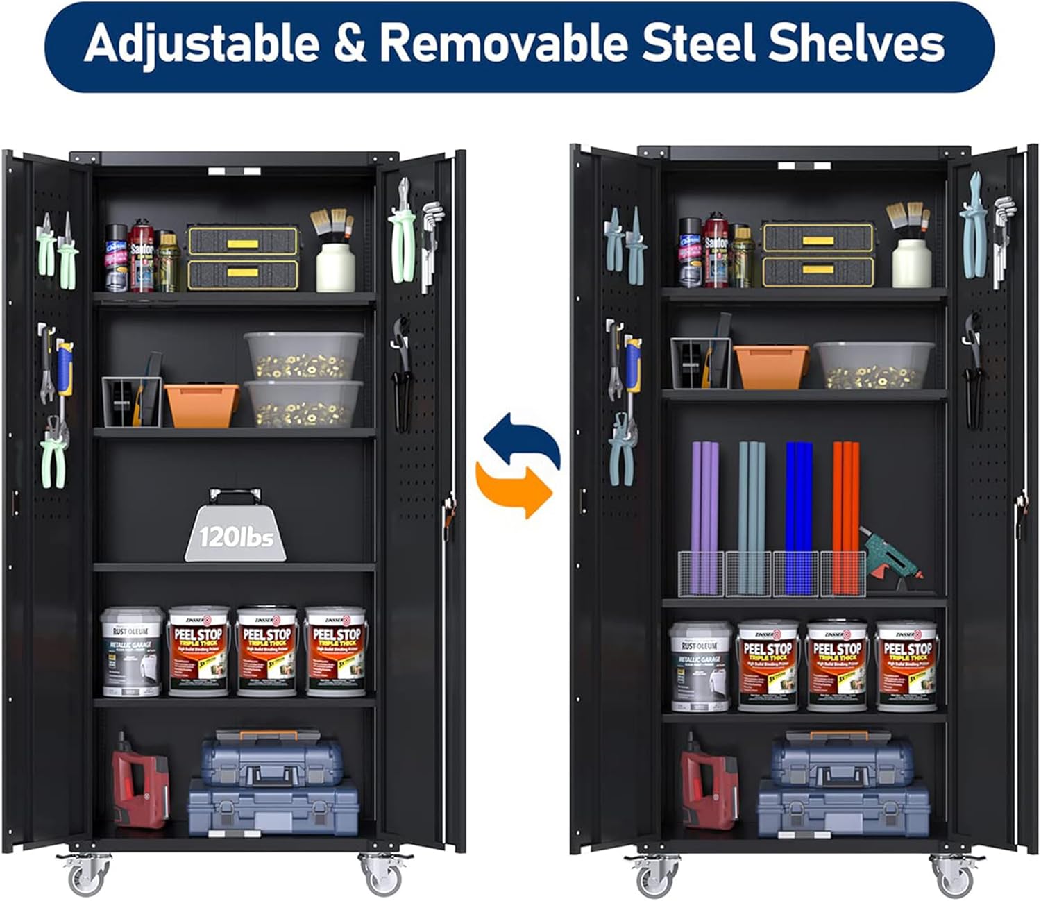 - ใUtility Pegboard & Adjustable Shelves ใRedesign your organizing ways, hang up everything on the door, get effortless accessible for a variety of small hardware, no more searching for things among the clutter. Tall Garage storage cabinet with wheels is designed with 4 adjustable shelves, you can easily meet your different storage needs by adjusting the height between the shelves.