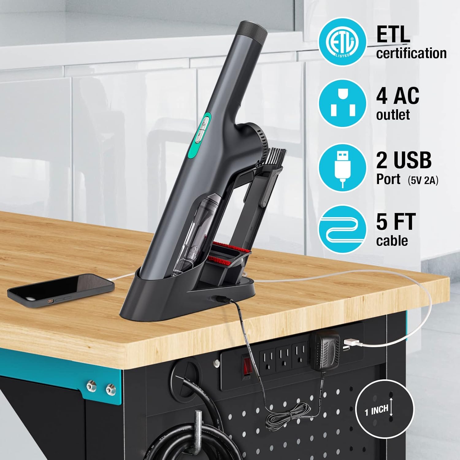 - 【Power Strip & Peg Board】The DURATECH workbench comes with power outlet and peg board. The outlet 4 AC outlets and 2 USB-A ports will supply you with power whenever you need to plug in any of your work equipment. Pegboard panels are a great tool for organizing and storing your tools, so you can customize your layout to suit your needs.