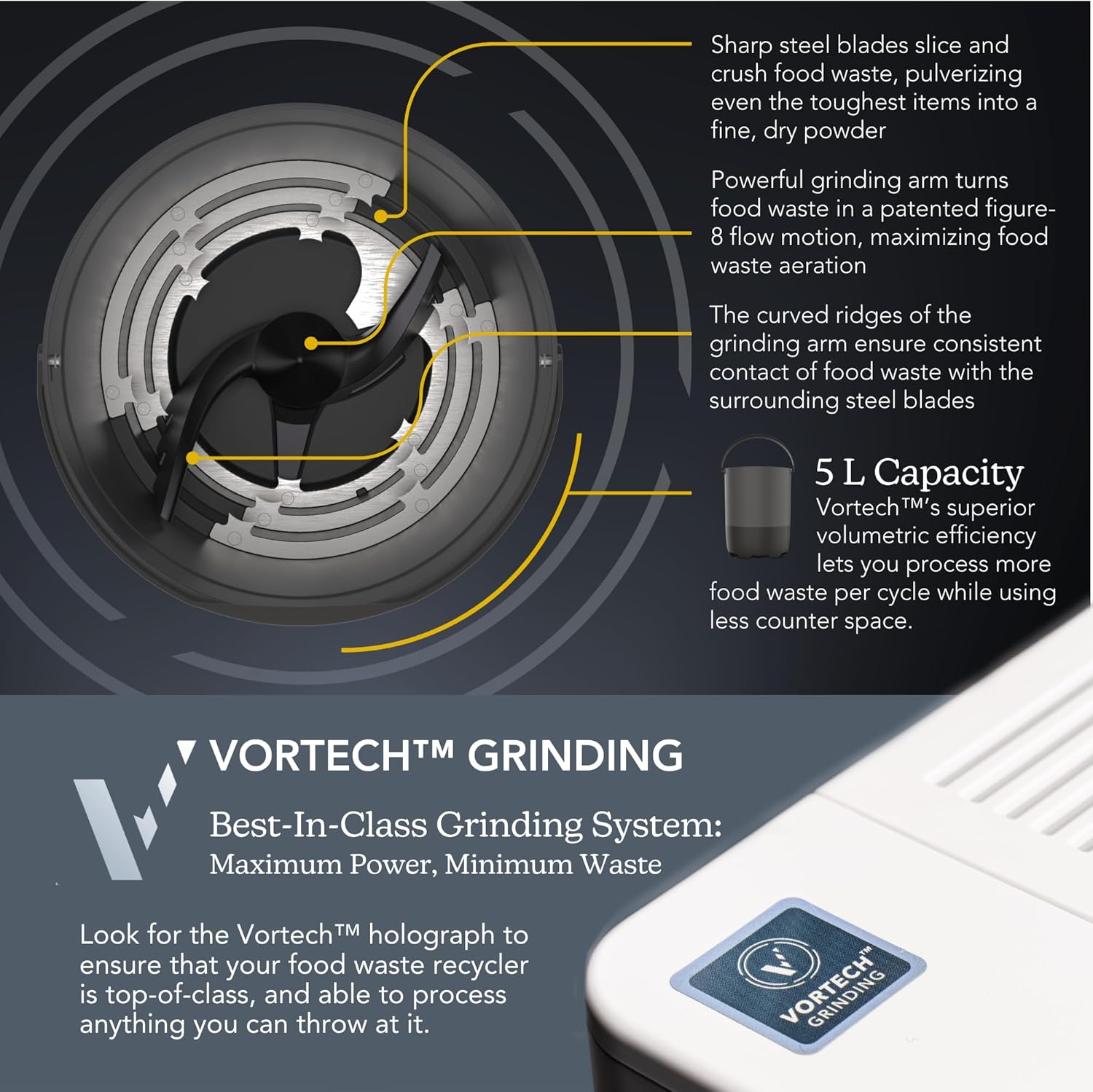 - INNOVATIVE VORTECH SYSTEM: The Eco 5โs Vortech(TM) patented grinding system can grind what others can't. Toss in your pits, peels, bones, leftovers! Vortech's efficiency means the FoodCycler indoor electric composter alternative consumes less power than your average clothes dryer.