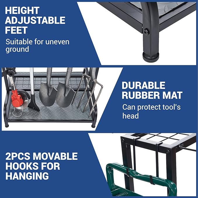 - STRONG DURABLE STEEL CONSTRUCTION: This garage tool rack and shed organizer made of a durable coated steel frame thatโs sturdy enough to withstand indoor or outdoor use. The thickness of the steel pipe has been upgraded to 2 cm, making it more sturdy and durable. You won't worry about collapsing like a plastic organizer