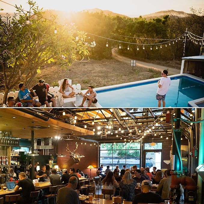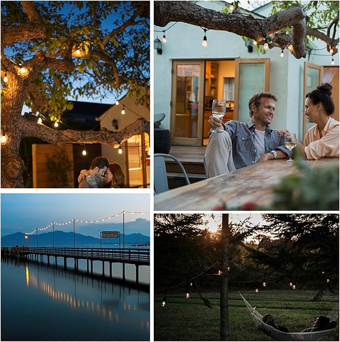- 【Safety and durable】 UL certified outdoor light string is built with weatherproof technology, which can withstand extreme temperatures, rain, wind, and damp climates. Safe and durable electric dimmable string light either with an E26 socket base and a built in spare fuse for easy replacement.
