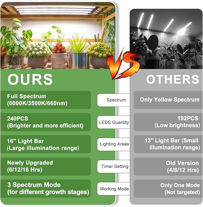 - Full Spectrum Grow Lights: Equipped with 240 high efficiency diode LEDs; Kullsinss grow light strip can emit wavelengths of 380 nm to 800 nm, just like natural sunlight; Ideal for plants at all growth stages, such as succulents, seedlings, flowers, etc