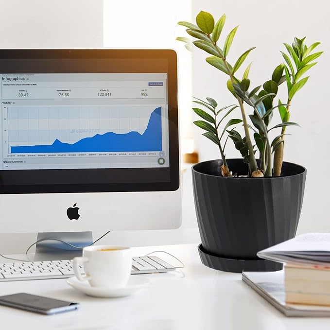 7 Inch Plant Pots Bulk, 6 Pack Plastic Planters with Drainage Holes and Saucers for Indoor Outdoor House Plants and Flowers, Black