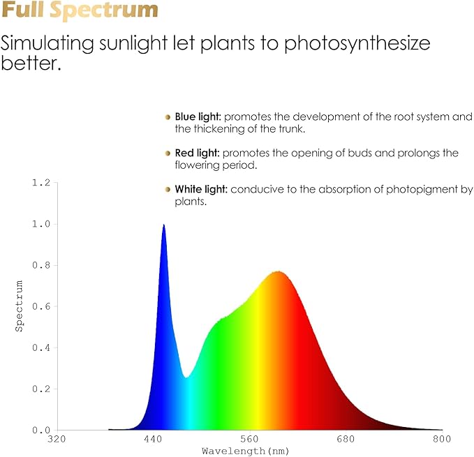 - 【12W Full-Spectrum Plant Light】: The compact growth light features high-quality, super-bright LEDs that emit wavelengths ranging from 380nm to 800nm, including 5000K White Light, 3000K Warm Light, 4000K White Light, and Warm Light. This plant growth light accelerates photosynthesis, effectively promoting the growth of indoor plants. It is ideal for various stages of growth for herbs, succulents, orchids, tomatoes, and more.