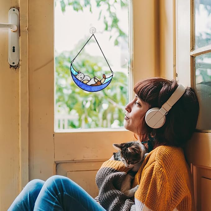 - SLEEPING CAT ON MOON DECOR: The Special Handmade Process Outlines the Adorable Appearance of the Sleeping Cat on Moon,the Whole Stained Glass Window Hanging Product Presents a Peaceful Image. Moreover Cat Sleeping On the Moon, Just Like Your Cat Crossing the Rainbow Bridge to the Moon and Back-Watching You From the Moon