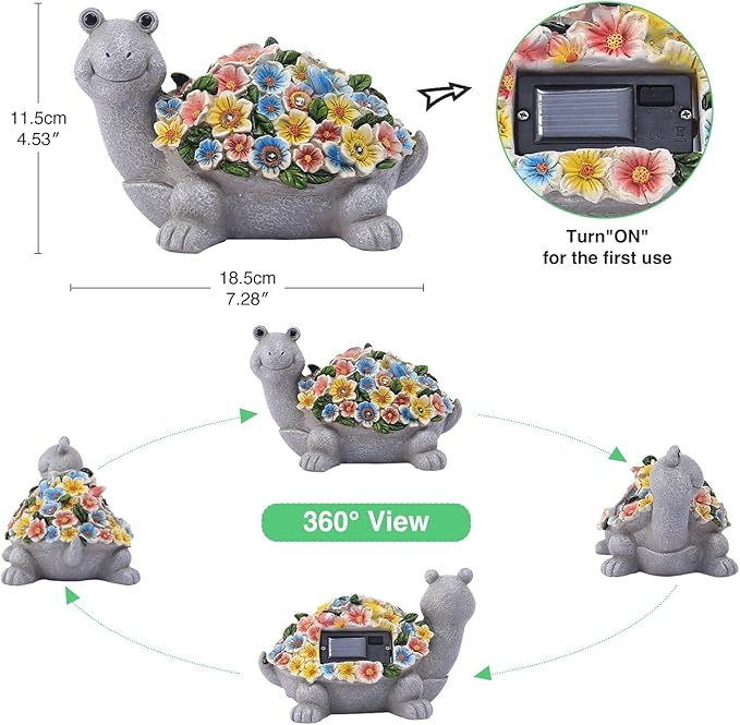 - 【Eye-Catching Design】: Add a touch of whimsy to your garden with this adorable Solar Garden Turtle Statue; its succulent flowers and LED lights create a charming and inviting ambiance day and night that will surely impress guests and brighten up your surroundings.