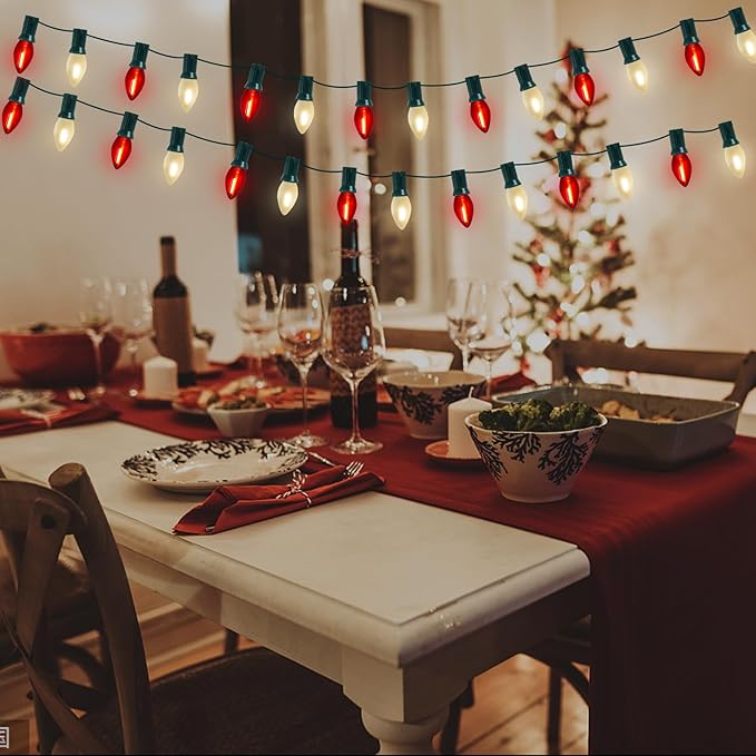 - π End-to-End Connectivity: 25Ft led christmas lights is end-to-end connector, 6" spacing from male plug to the first bulb, 12" spacing between bulbs, 6" spacing from last bulb to tail female connector. C7 red white and white christmas lights can be connected up to 28 strands together to cover larger areas and create a uniform holiday lighting display.