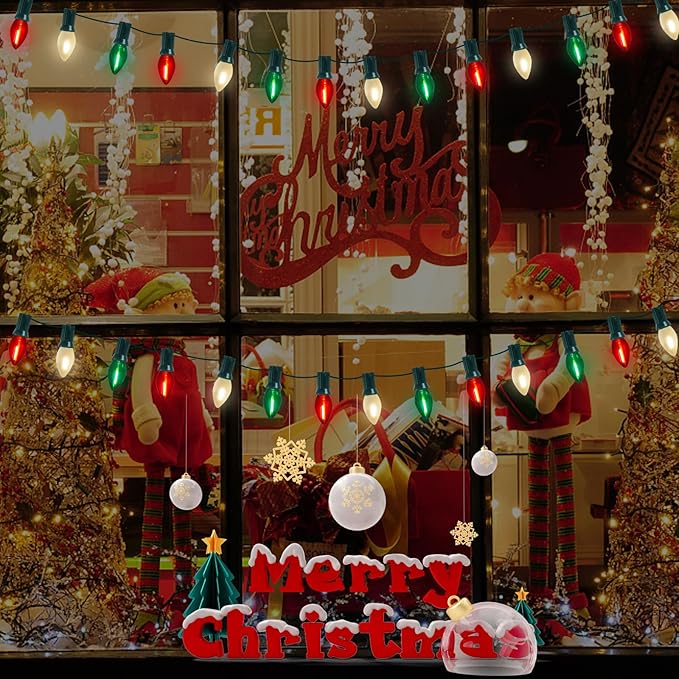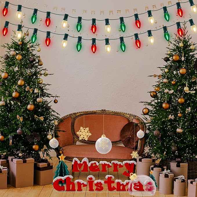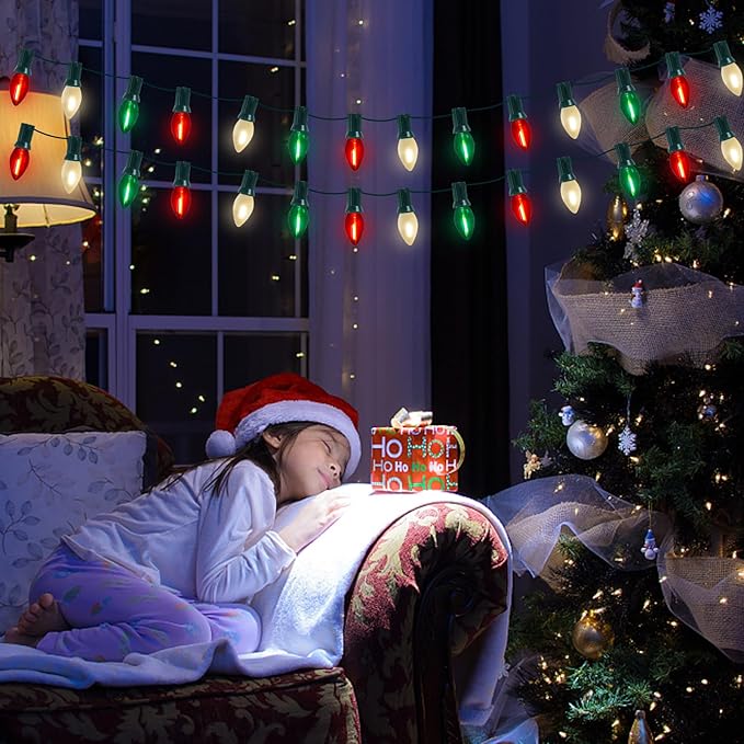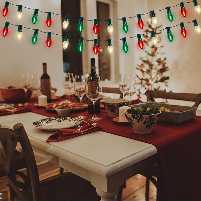 - π Versatile Application: C7 led Red white and green christmas decorations lights glow a warm white lights, vintage Christmas light string is dimmable, lights dimming requires a dimmer. c7 led christmas lights can be used both indoor and outdoor, such as the bedroom, bar, window, Christmas tree, party, wedding, window, holidays, festivals, shows, restaurants, hotels, shopping centers, patio, or porch, pathway, roofline decorations and lightings