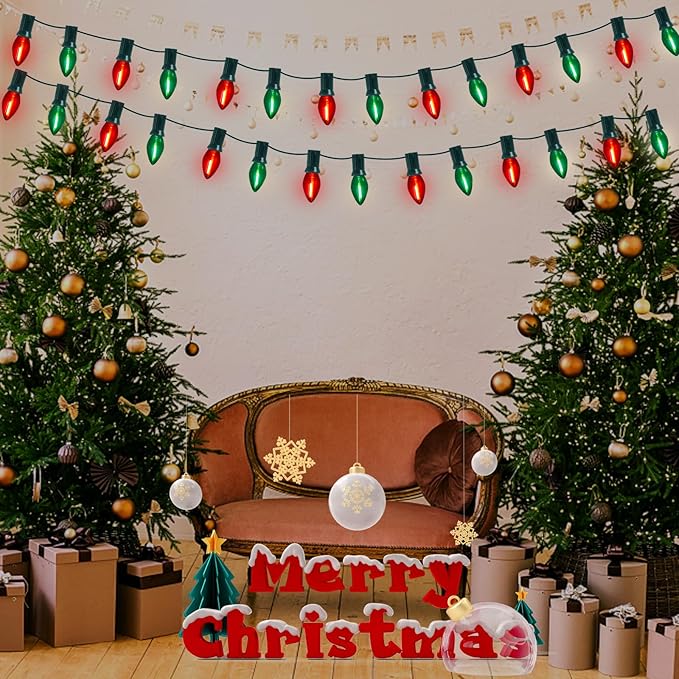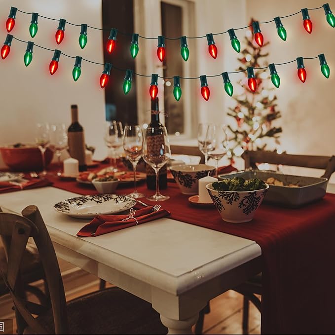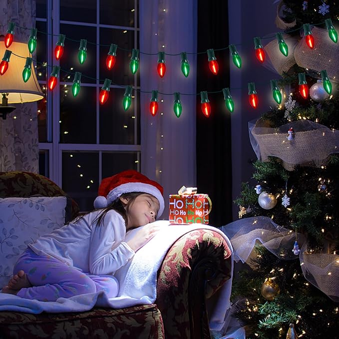 - π Versatile Application: Red green christmas decorations lights glow a warm white lights, retro Christmas light string is dimmable, lights dimming requires a dimmer. c7 led christmas lights can be used both indoor and outdoor, such as the bedroom, bar, window, Christmas tree, party, wedding, window, holidays, festivals, shows, restaurants, hotels, shopping centers, patio, or porch, pathway, roofline decorations and lightings
