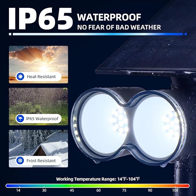 - IP65 Waterproof and Auto On/Off: No need to worry about bad weather. These solar lights outdoor waterproof can withstand snow and heat, operating from 14°F to 104°F. They automatically turn on at night and power off at dawn. Ideal for lighting yards, driveways, lawns, patios, pathways and more