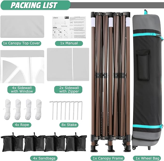 - [Included Accessories] 1x Commercial Grade 10x20 Pop Up Tent Frame, 1x Top Cover, 4x 420D Oxford Fabric PVC Coated Sandbags, 8 x Ground Pegs, 4x Windproof Ropes, 1x Rolling Bags, 1x Manual.If you have some problems and questions, please feel free to contact us, we will give you the best help. Choosing us means choosing a comfortable life.