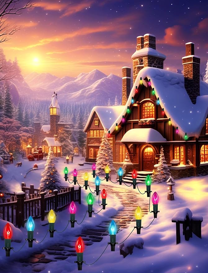 - โจPractical and waterproof: C9 multicolor christmas string lights outdoor is hanging and plugging, Hang up C9 colorful string lights around your roofline decor or plug the C9 christmas driveway lights in lawn garden. christmas sidewalk lights crafted from weather-resistant materials, they are designed to withstand the elements, ensuring your pathways remain beautifully illuminated come rain, snow, or sunshine.