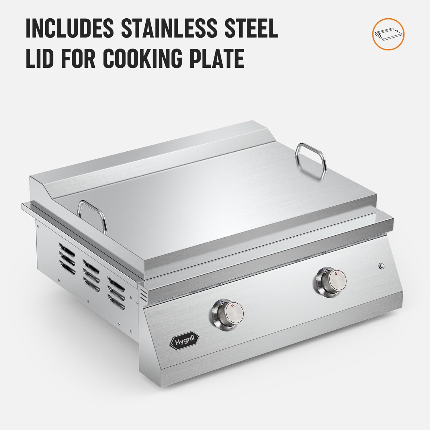 Hygrill 30-Inch Premium Built-In Liquid Propane Griddle for Outdoor Kitchen, Durable Stainless Steel 2-Burner Flat Top Grill with Lid and LED lights, 36000 BTUs