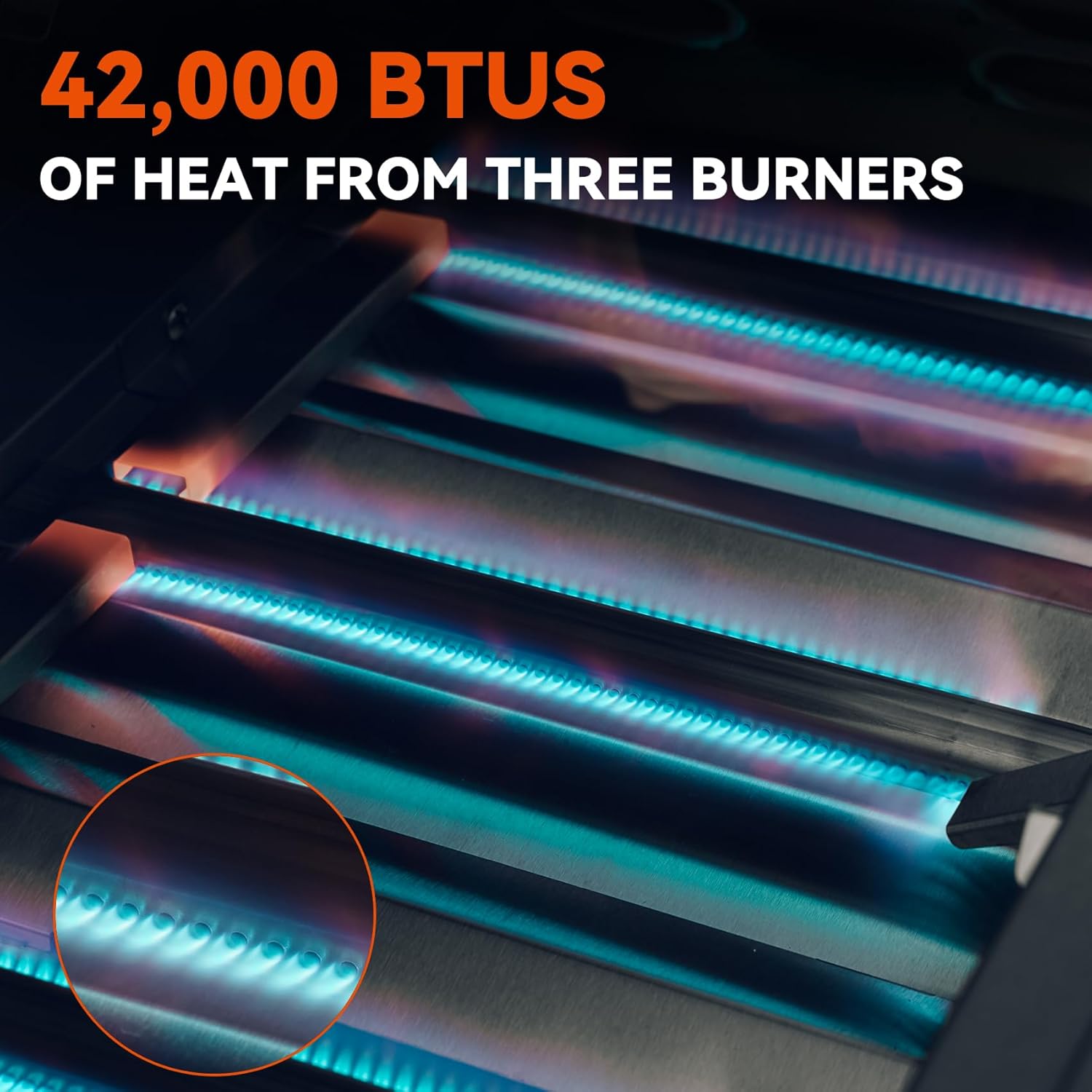 - 【Even and Efficient Cooking System】 The built in grill has 3 stainless steel tube burners to produce even heat; the efficient bbq grill help reduce your cooking time and provides steakhouse quality searing.
