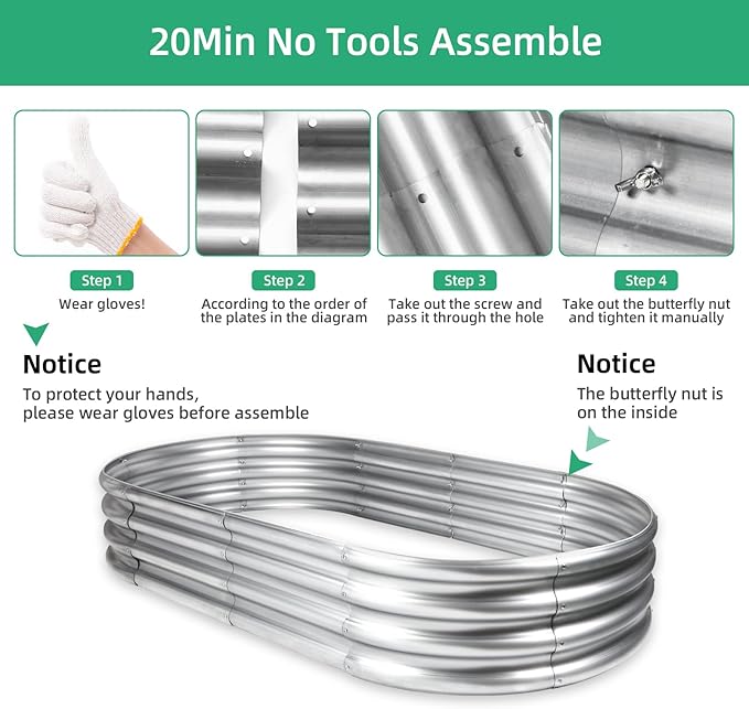 - 【Assembly without Tools】:Our galvanized planter for outdoor plants has been upgraded its accessories with new type of butterfly nuts. Assembly does not require tools, only manual rotation of the butterfly nut is required to tighten two galvanized sheets. More stable than regular nuts, easy to assemble. Notice: Galvanized sheet is heavy, we suggest wearing our gloves for operation.