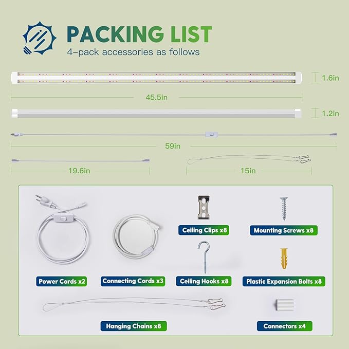 - Easy Installation: Two installation ways—Hanging or Mounting, with included wire rope hooks, clips, connectors, hooks and screws, you could install the plant grow lights indoors by yourself in minutes