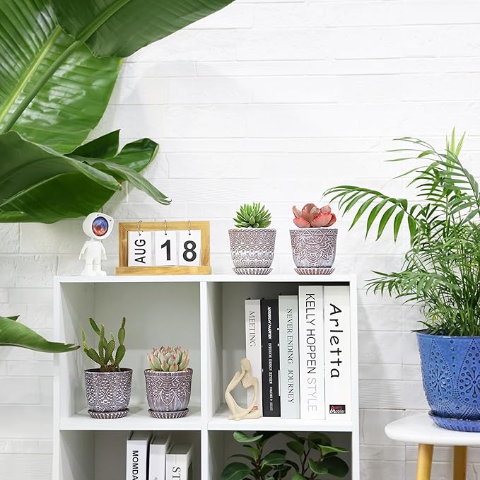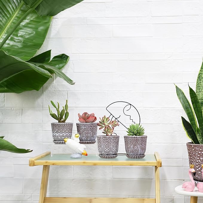 - Size & Package: 4.0 Inch Pot - Set of 4. Package: contains 4 ceramic flower pots, 4pcs mesh pads and 4pcs saucers(NOT INCLUDE PLANTS)