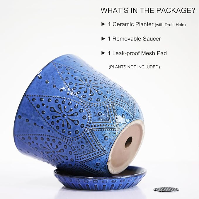 • Size & Package: 8.0 Inch Pot . Package: contains 1 ceramic flower pots, 1pcs mesh pads and 1pcs saucers(NOT INCLUDE PLANTS)
