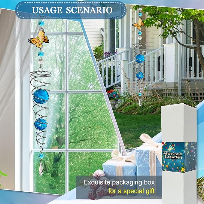 - 【HIGH QUALITY】:FONMY butterfly Crystal wind spinner sun catcher is made of stainless steel wire with K9 crystal material, special double structure spiral tail w/ solid color K9 crystal glass ball,promised good weather resistant and amazing decoration. All FONMY crystal ball made of top crystal glass material with finely crafted, high clarity and cast beautiful rainbows, could turn the sun's rays into many rainbows.