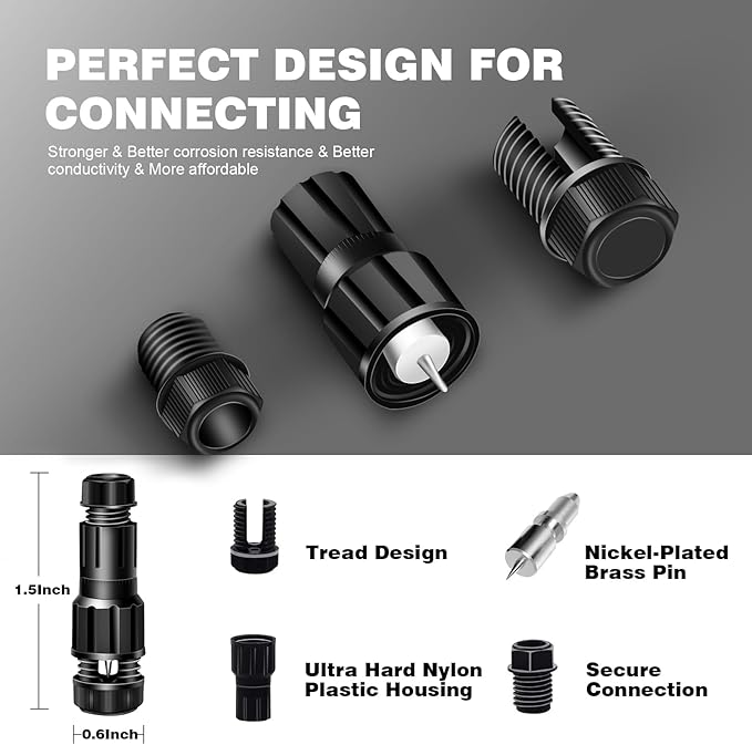 - ★Easy Installation: Equipped with 8pack fastlock wire connectors, made from extremely hard nylon plastic with machined terminal brass pins,no Splicing/Crimping or tools required! Quickly and easily install to lighting fixture. (each light comes with 2 conncetors)to connect the low voltage electric cable. Extra accessories needed :low voltage transformer, low voltage electric cable(not included in this sets).