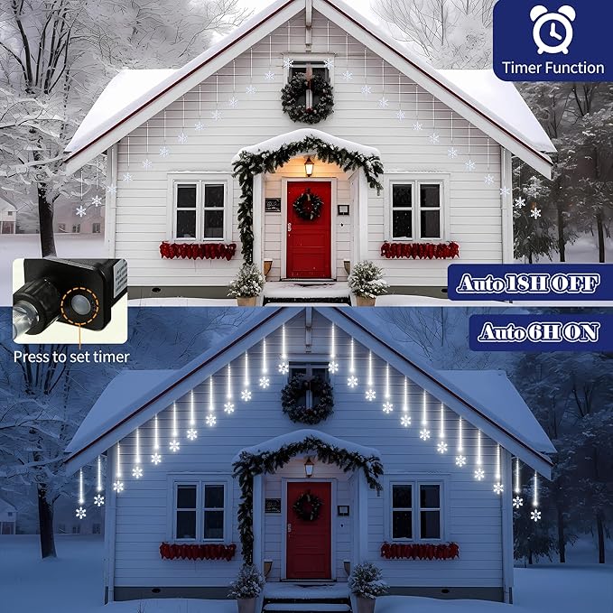 - Stunning Meteor Shower Snowflake Effect: create a mesmerizing atmosphere with our 480 LED Christmas meteor shower snowflake lights; With a good snowflake design, each of the LED lights will light up and down one by one in sequence and quickly, emitting cool white light, like realistic meteor showers or snow at night; The cascading snowfall effect will add a touch of magic to your Christmas decorations