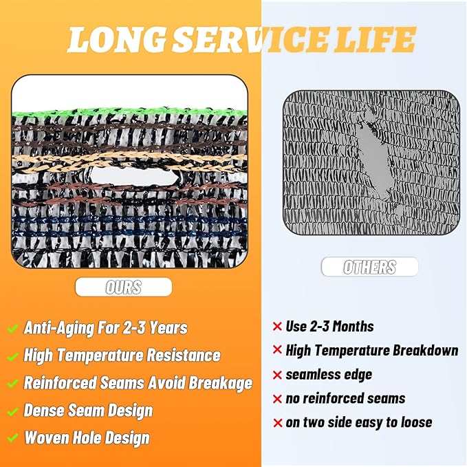 - 【Special Woven Hole Design】Made with new high density polyethylene (HDPE) material which Provides extra convenience for installation, garden shade cloth can block 40% of the sun and provide UV protection.