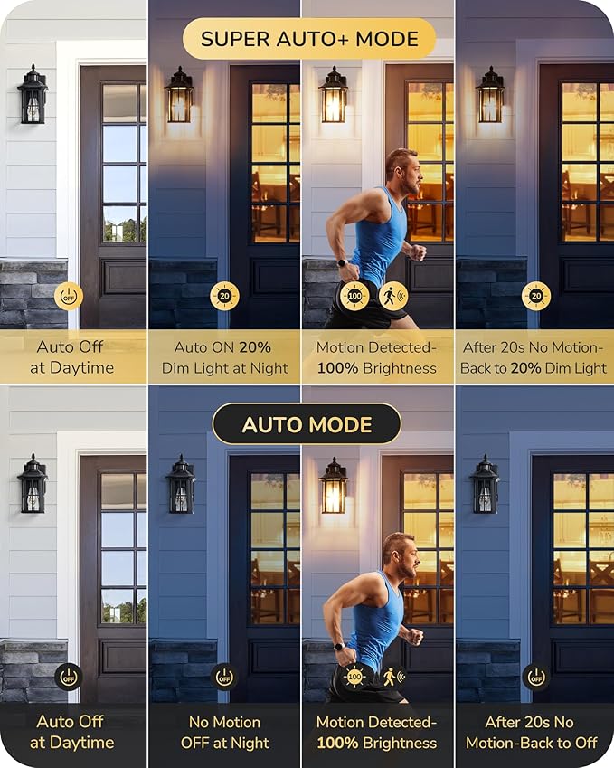 - [Upgrade 3 Lighting Modes] 3 lighting modes available, ① Auto+: 20%-50% brightness at night, 100% light once motion detected, 20-180s no motion back to 20%-50% dim light; ② Auto: off at daytime, auto on 100% light when motion detected, auto off after 20-180s no motion; ③ PC: auto off at daytime, auto turn on outdoor wall lantern at night