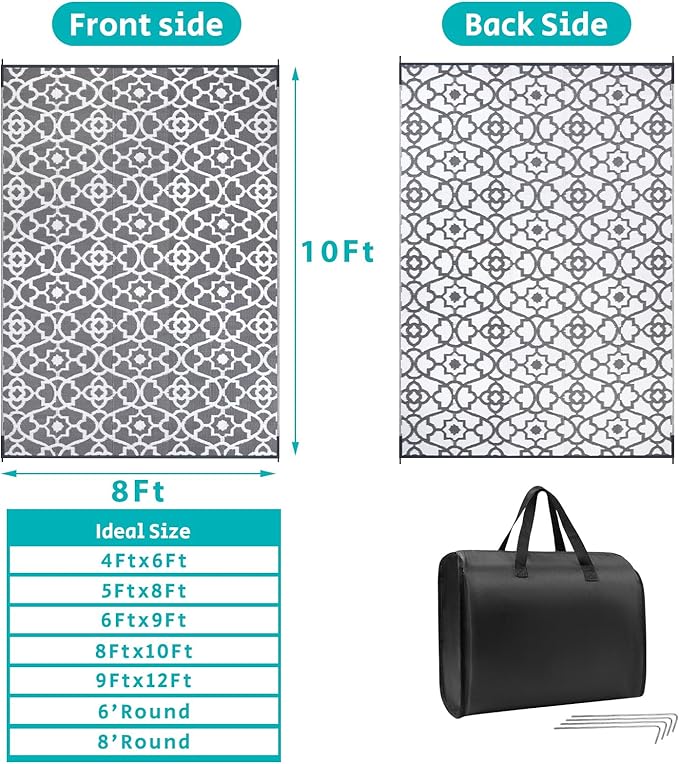 • Versatile Outdoor Carpet: The indoor outdoor plastic rugs have multiple choice in different colors(4'x6',5'x8',6'x9',8'x10',9'x12',9'x18',8'round), is ideal for a variety of indoor outdoor activities,like patio mat, deck rug, garden rug, beach mat, picnic mat, BBQ party mat, rv camping rug,pool rug,outdoor doormat,garage rug,front door mat,allowing you to have plenty of imaginable space for more fun.