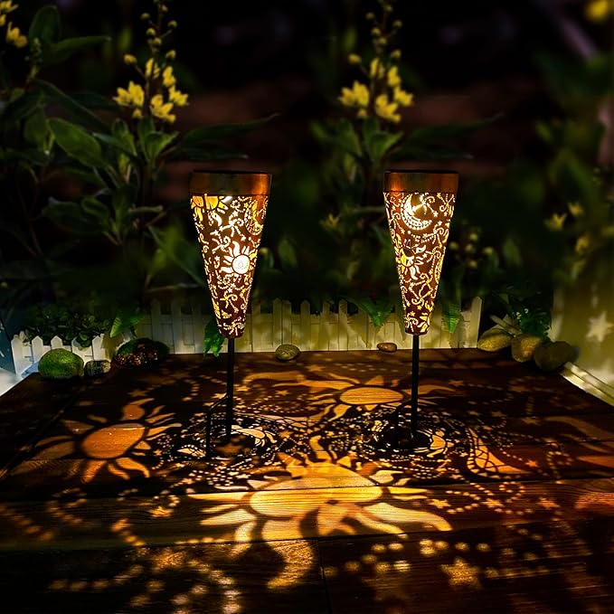 - 【Gorgeous & imaginative Garden Decor 】 Fusion the retro gold, copper of exteriors and irregular pattern inside, at darkness, the solar top casting a bright, warm light with Sun and Moon pattern, Excellent choice for pathway decoration