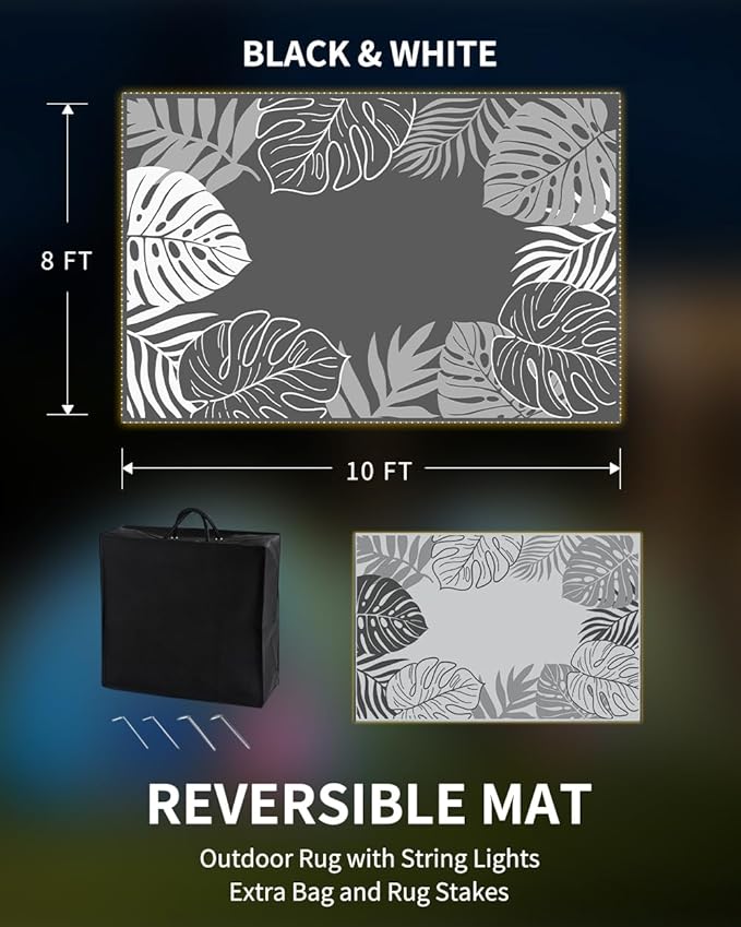 - Reversible&Wide Use: Outdoor rug featuring advanced black surface and visually expanding white side, patio rug creates perfect outdoor decor for relaxation and entertainment. The delicate flower pattern adds personality, making it ideal for gardens, patios, balconies, backyards, beaches, and indoor areas. Available in sizes: 5x8, 6x9, 8x10 and 9x12.