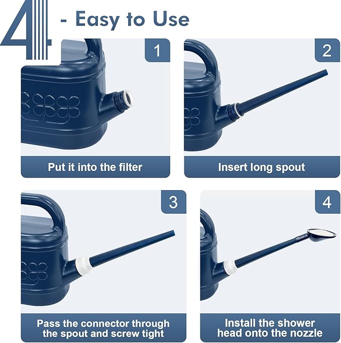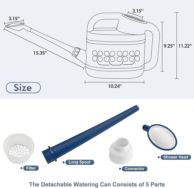 - [PRECISE WATERING, WATERING FLOWERS WITHOUT WORRY]-Plant watering can has a removable long spout, easy to carry and store, when installing, pass the connector through the spout and screw tight, seals well with no leak. Long spout watering can easy to reach distant plants, watering easily without bending over or tilting it too much, it easy to control the overall water flow, directing water exactly where it is needed, allowing every part of the plant to fully absorb the water.