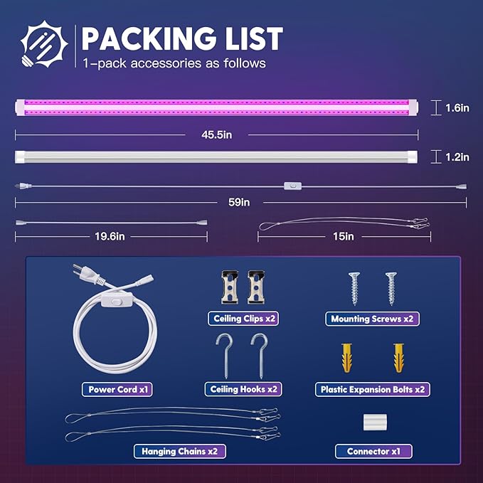 - Easy Installation: Two installation waysโHanging or Mounting, with included wire rope hooks, clips, connectors, hooks and screws, you could install the grow lights for seed starting by yourself in minutes