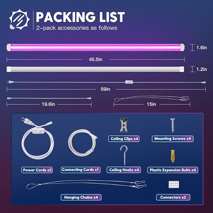 - Easy Installation: Two installation waysโHanging or Mounting, with included wire rope hooks, clips, connectors, hooks and screws, you could install the grow lights for seed starting by yourself in minutes