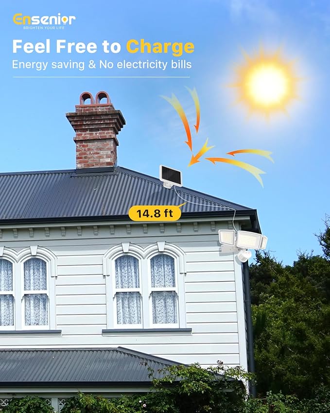 Ensenior 1800LM Solar Flood Lights Outdoor, Motion Sensor Outdoor Light 6500K, IP65 Waterproof, Separate Solar Panel, Solar Security Light with 5 Sensor Modes and 3 Adjustable Head for Yard (White)