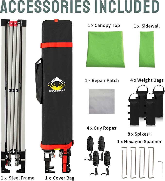 - STOโ N GO SYSTEM - Our lift-free system makes collapsing, storing, and transporting the 10x10 tent a breeze. The 10x10 tents can be stored with the fabric attached, with a specialized pocket for 4 sandbags, 8 stakes, and 4 guy ropes. Integrated wheels in the feet allow easy movement even when the instant shelter tent is set up, by simply lifting the side without wheels. This feature is especially useful for quick setup and takedown at locations like the patio or sports events