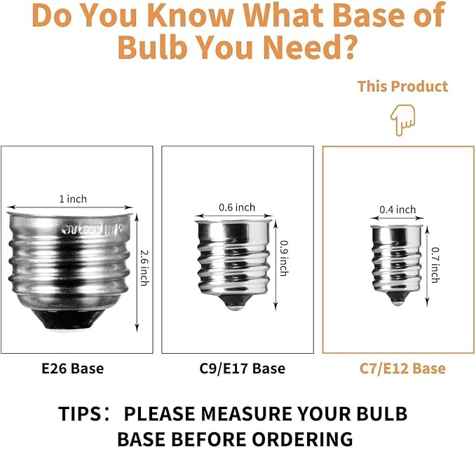 - Fits sockets: E12 or C7 candelabra nickel base which prevent corrosion. Each piece 120V 5W