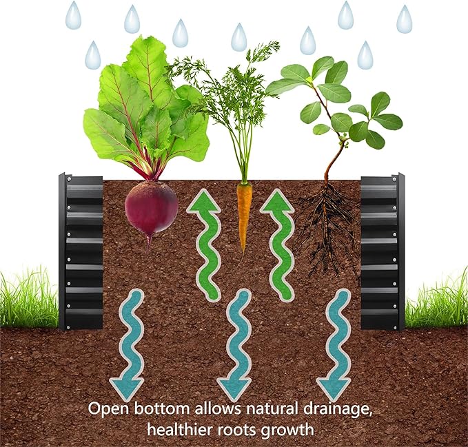 - OPEN BOTTOM: Sits on the ground garden bed, allows natural drainage, prevent waterlogging and root rot. It encourages the plantsโ roots to grow deep into the ground, promoting stronger and healthier plants.