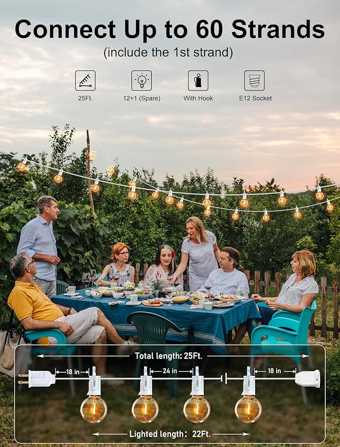 - Connectable & Portable: 12 hanging sockets, 18 inch lead with male plug, 24 inch spacing between bulbs, 18 inch tail with female connector, total length 25 feet. End to end connect up to 60 strands (include the 1st strand). Portable size for easy carrying and storage