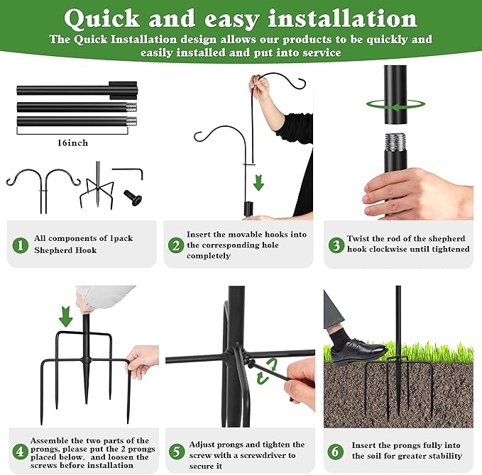 - Easy to Assemble & Use: Our bird feeder pole is quite easy to install or remove down, each metal bird feeder hanger rack includes 1 base prongs, 2 hook arms and 3 high-quality steel pipes. They can easily be assembled in a matter of minutes, just simply spin the ends of the extendersโ poles together and finish assembly. Our shepherds hooks for hanging basket and bird feeder occupies a small space, and convenient for storage.
