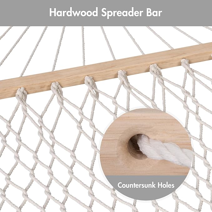 - SPREADER BAR HAMMOCK: 52 inches hardwood spreader bar has countersunk holes, hence reducing the friction between the rope and wood, offering maximum durability and stability. Our hammock significantly outperforms othersโ non-countersunk varieties