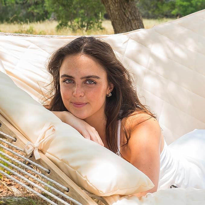 ANOW Outdoor Rope Hammock with Spreader Bars, Heavy Duty Hammock with Pad for Outdoors, 450 LBS Weight Capacity, Cream