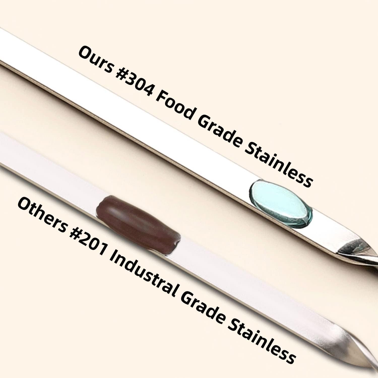 - 【304 barbecue skewers have weak magnetism】304 stainless steel is non magnetic or weakly magnetic. 304 stainless steel may have weak magnetism because during the processing and forging process of the product, a small amount of austenite is converted into martensite, so 304 stainless steel may have a little magnetism. Our barbecue skewers may have a slight magnetism due to the processing of the tip and handle, which is a normal phenomenon.
