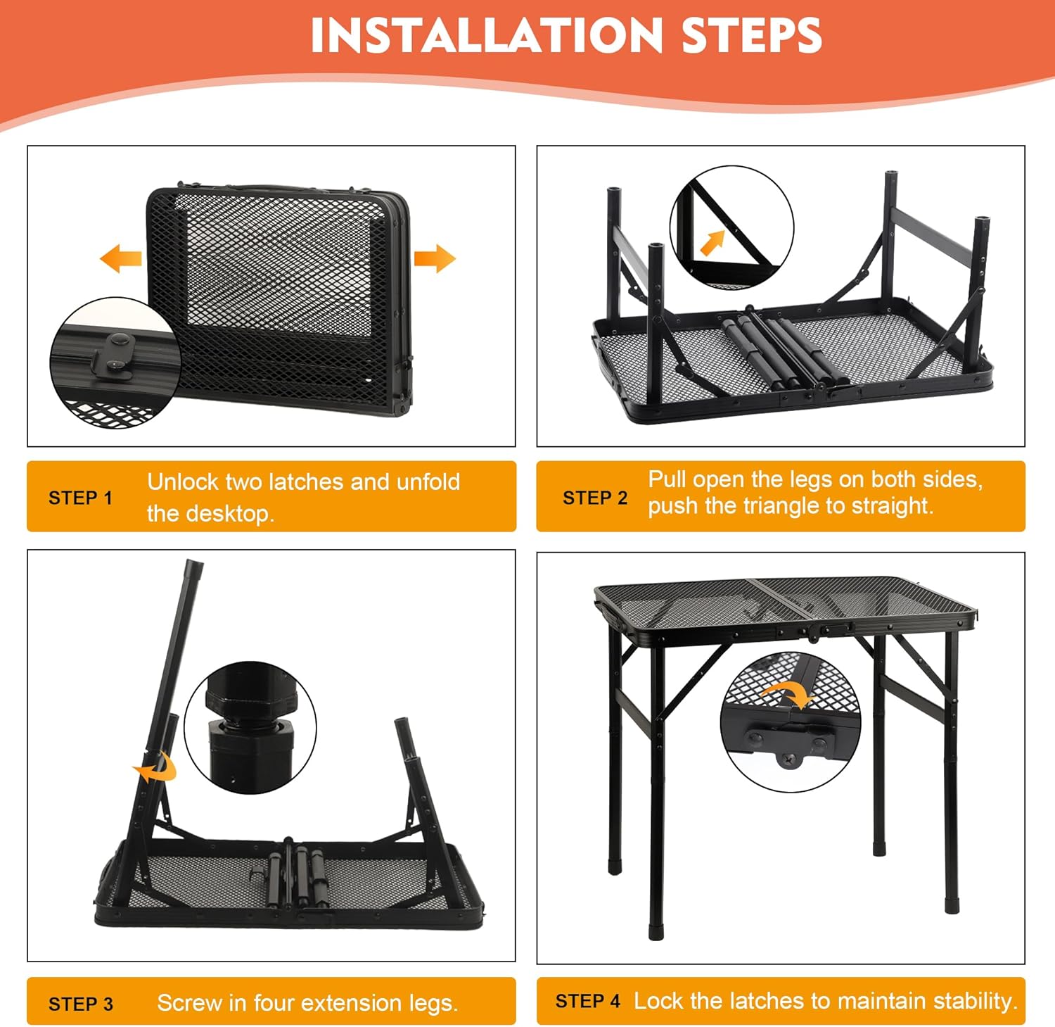 Camping Table with Mesh Desktop, Lightweight & Portable Folding Grill Table, Height Adjustable Metal Outdoor Table for Camp, Cooking, BBQ, RV, Picnic-3 FT Black